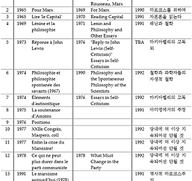 The Selected bibliography of Louis Althusser 알튀세르 저작들과 출판년도 등을 정리해보았다. 출처는 영어, 프랑스어 위키피디아와 고쉬가리언의 원고(알튀세르 탄생 100주년 기념 학술대회), 그밖에 구글링한 것들 등을 조합하였다. 제목과 함께 괄호 안에 기재한 연도는 원고의 집필시기이다. 그러나 출간연도 및 출판연도는 다소 부정확하다. 처음 공개된 시기와 정식 출판시기 등이 혼재해 있고, 경우에 따라서는 프랑스가 아니라 스페인에서 먼저 공개되어 그 연도가 기재된 것도 있다. 해당 원고의 영문과 국문 출판도 정확하게 결합되어 있는지 확신이 서지는 않는다. 필요이상으로 열심히 정리했지만, 단순 참고용으로 밖에는 사용할 수 없겠다. 오류가 확인되면 앞으로 차차 수정할 예정이다. 번역되었으나 누락된 것들도 있을 것이다. 더보기